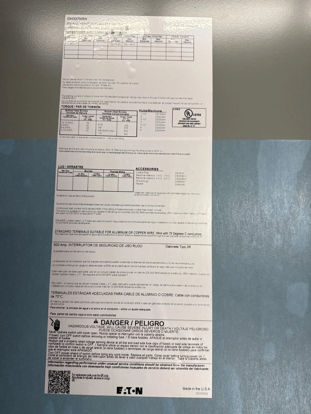 Eaton DH327NRK Safety Disconnect Switch 800A 3P 240V 3PH 3R Outdoor 800 Amp 3 Pole