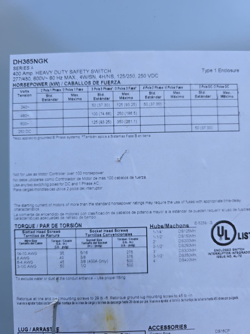 Eaton DH365NGK Safety Disconnect Switch 400A 3P 600V NEMA 1 Indoor 400 Amp