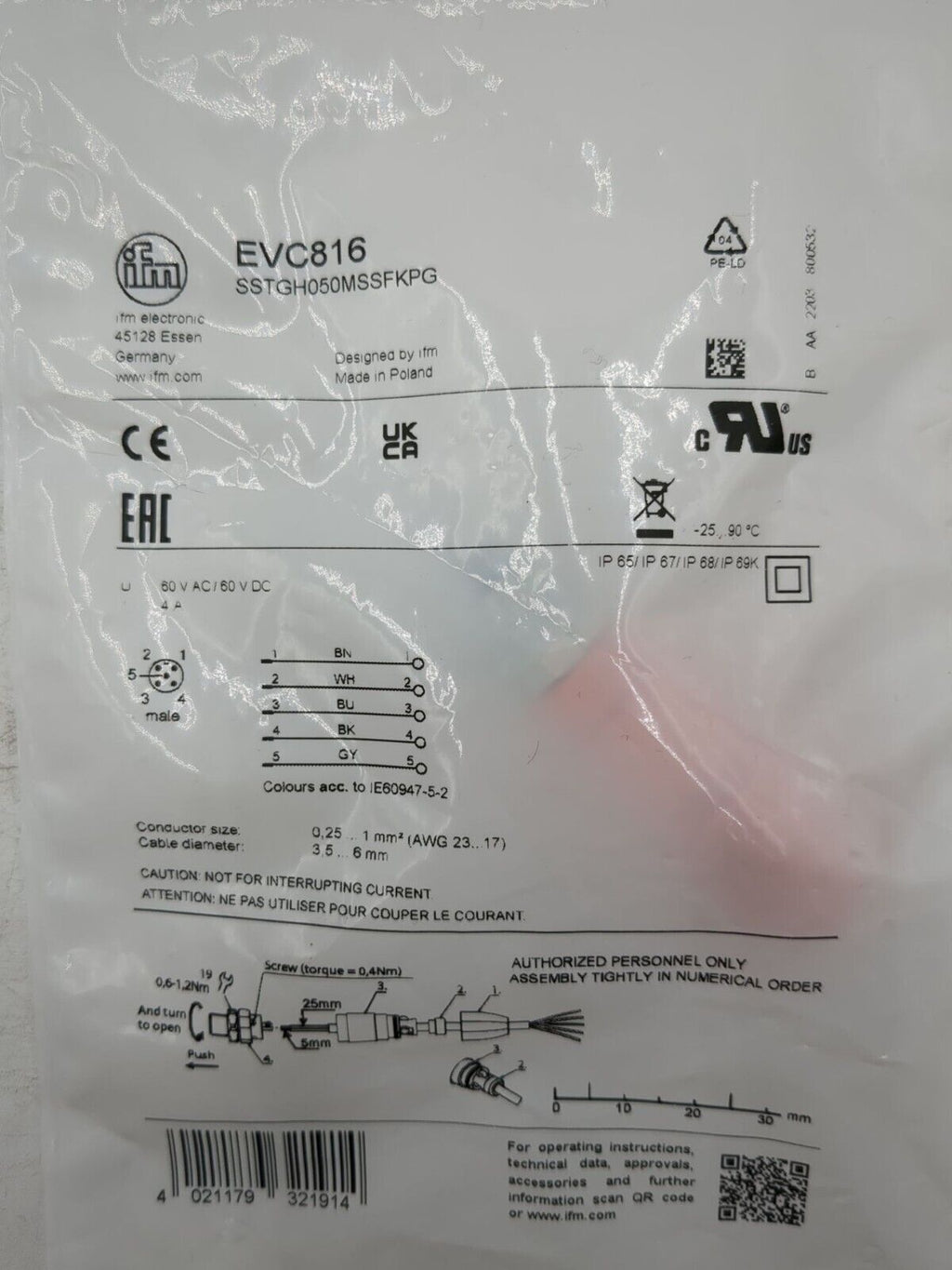 SSTGH050MSSFKPG-EVC816 EFECTOR WIRABLE PLUG, M12 CONNECTOR, MOULDED BODY: PA 6.6, LOCKING: BRASS / NICKEL PLATED, SEALING: FKM, CONTACTS: GOLD PLATED, SCREW TERMINALS, AWG 23 / 17 Never
