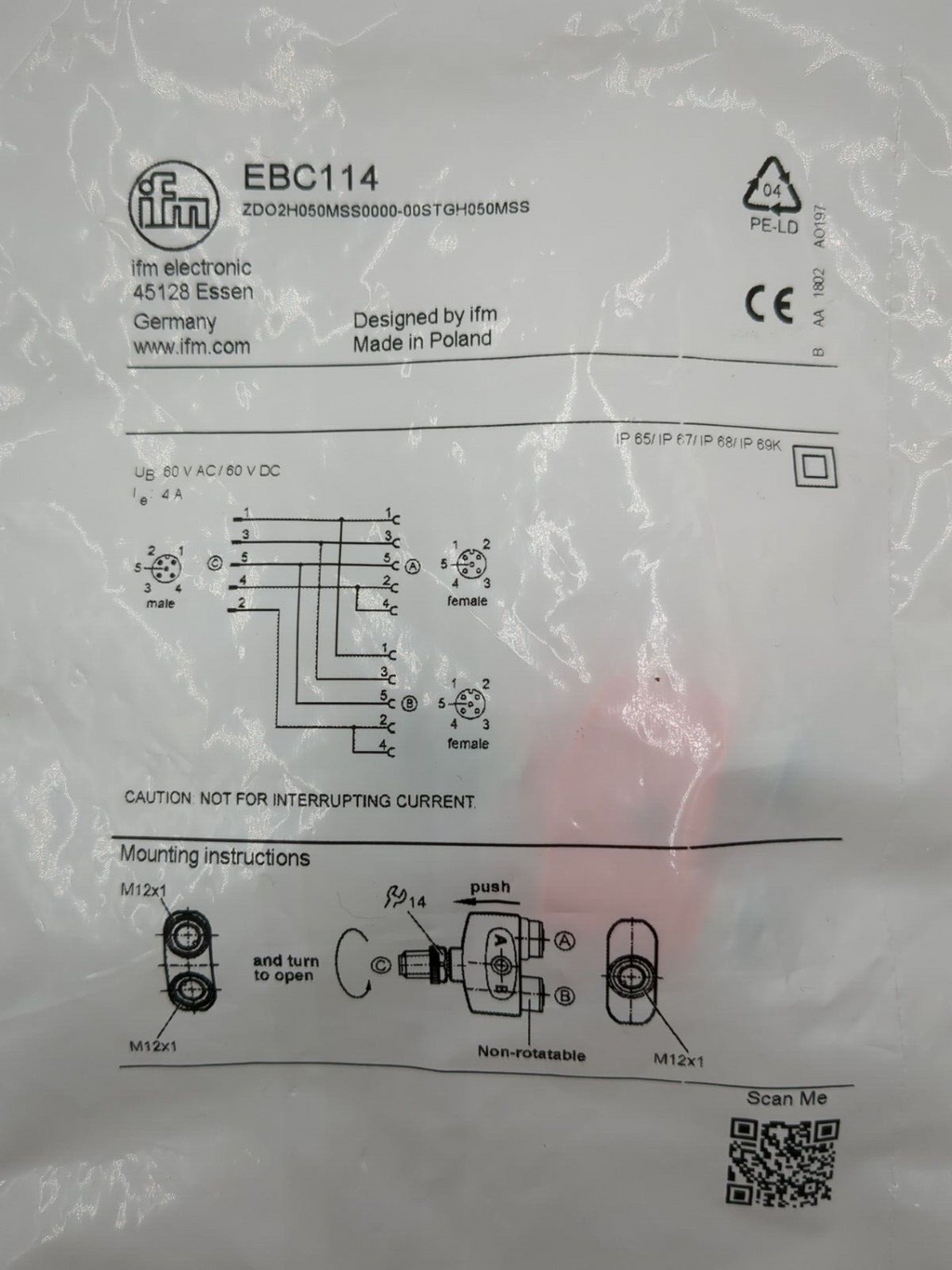 ZDO2H050MSS0000-00STGH050MSS-EBC114 EFECTOR Y-SPLITTER, RESISTANT TO OILS AND COOLANTS, 4 AMP, 60VAC/DC, M12 5 PIN CONNECTOR,-25TO +90 DEGREE C, IP65/67/68/69K, EBC114 Never