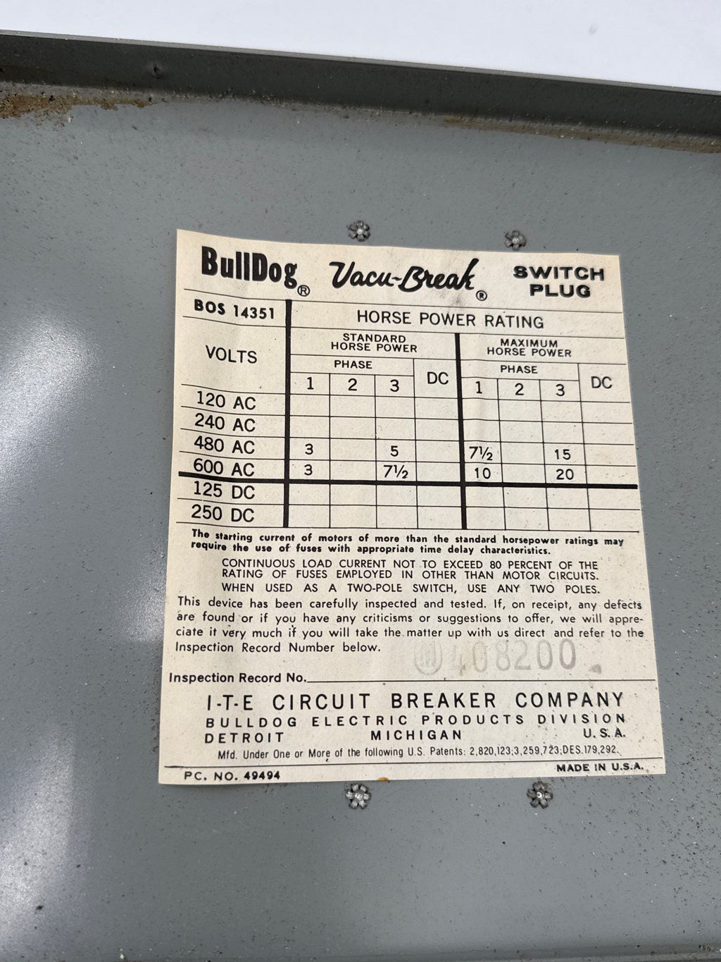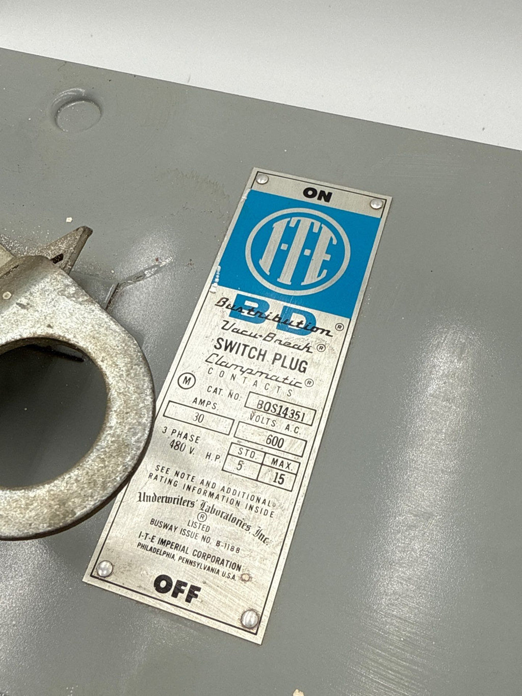 ITE BOS14351 Bus Plug Switch 30A 3P 600V VacuBreak 30 Amp