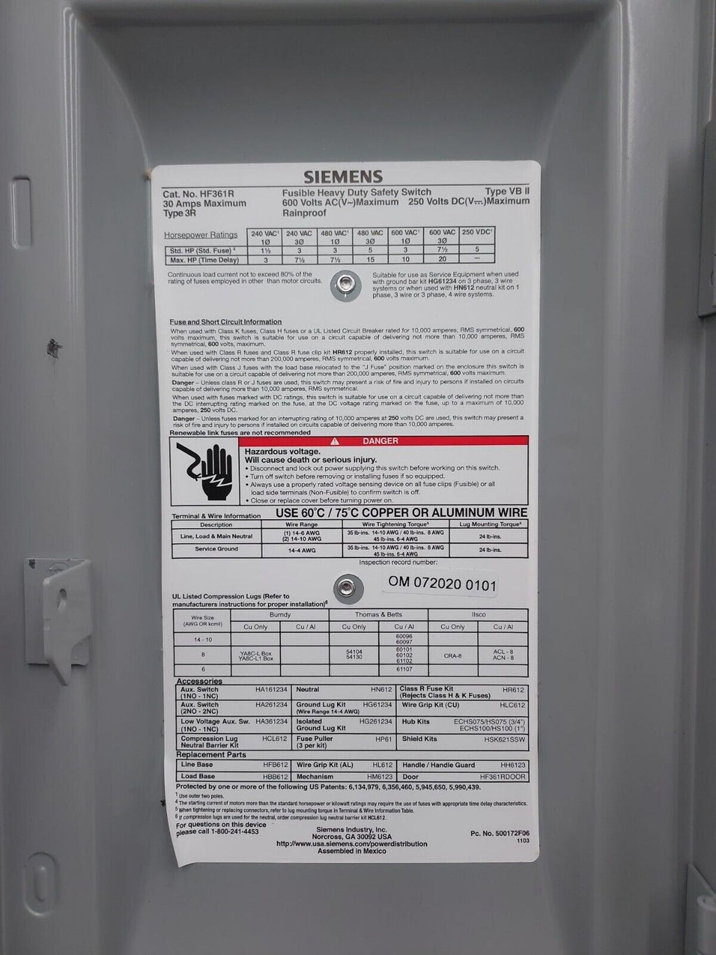 Siemens HF361R 30 Amp 3 Pole 600 Volt 3 Wire Fused Heavy Duty Safety Switch,