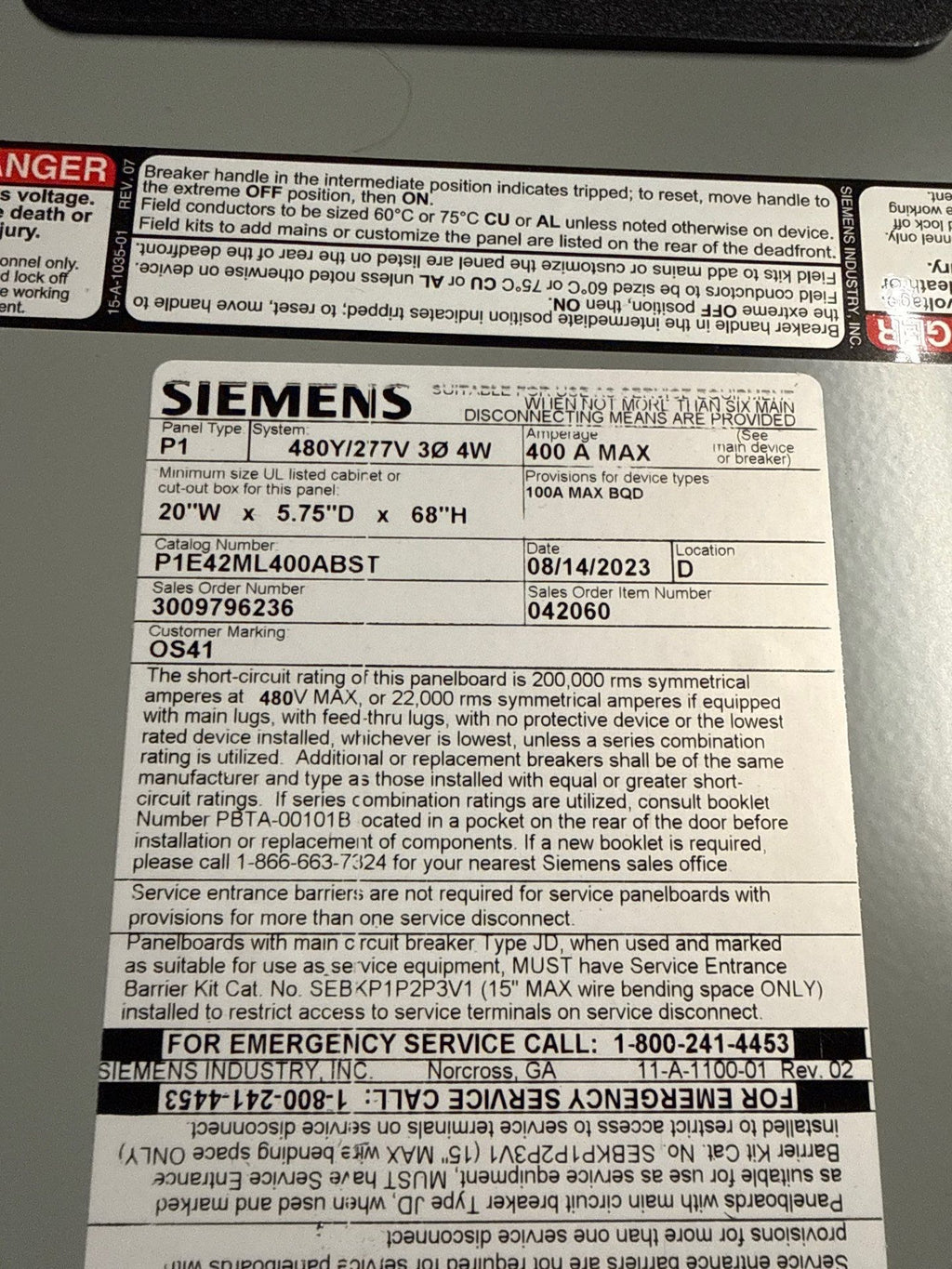 Siemens P1E42ML400ABST Panelboard 400A 480/277V 3PH 4W MLO Panel 400 AmpIndoor Box B68Weight and Dimensions: 250lb 68 x 20 x 6