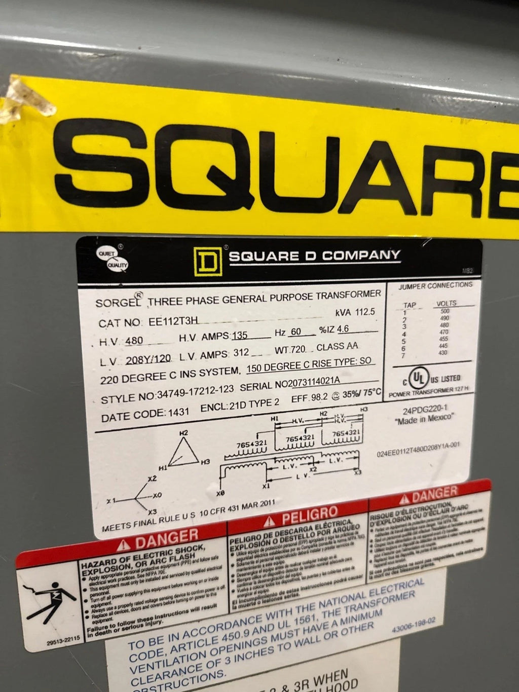 112.5KVA Square D EE112T3H Transformer Pri 480V Sec 208Y/120V 3PH Indoor T283