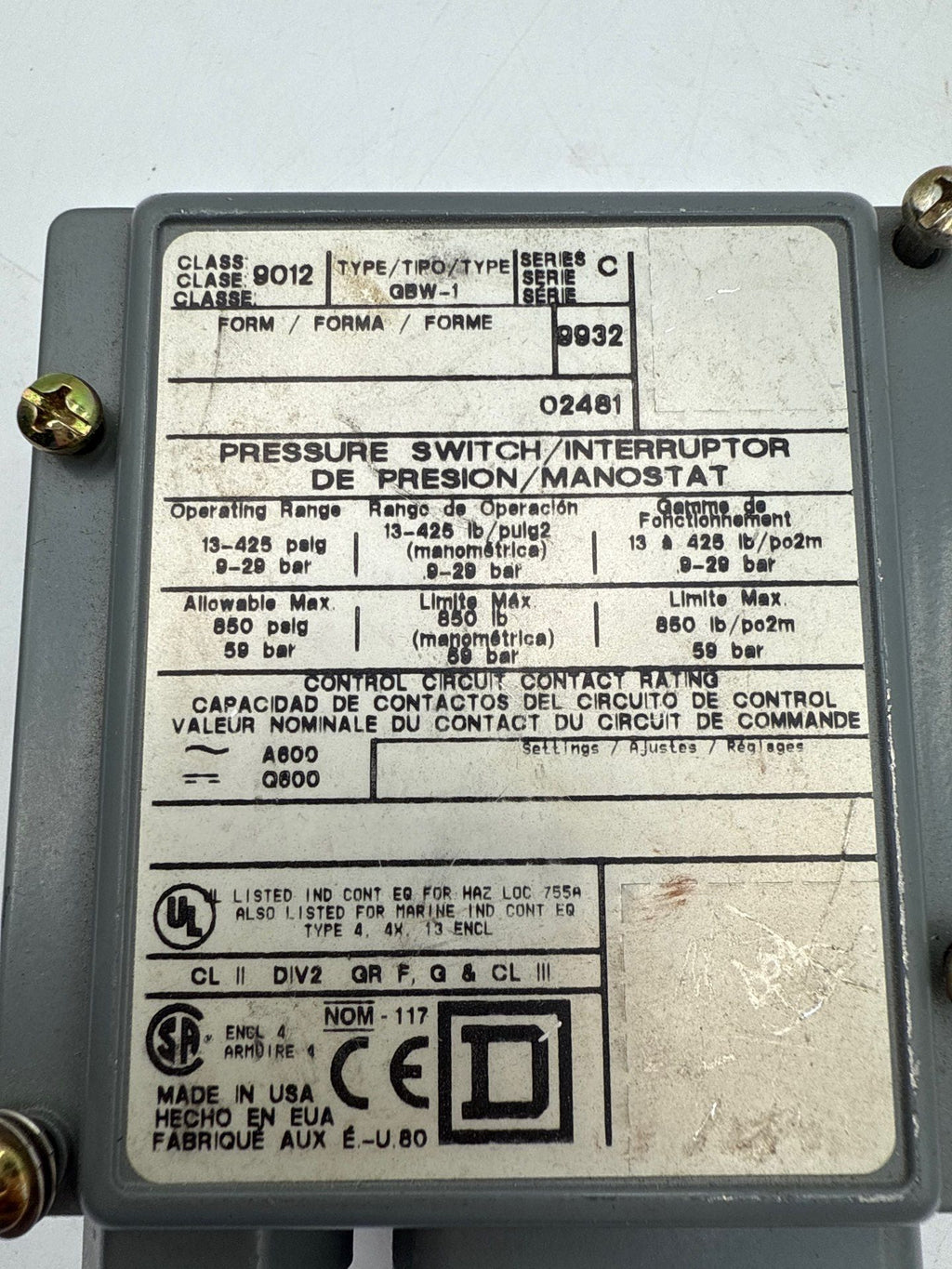 Square D 9012 GBW-1 Pressure Switch Adjustable 13-425 PSIG 120/240V 9012GBW1