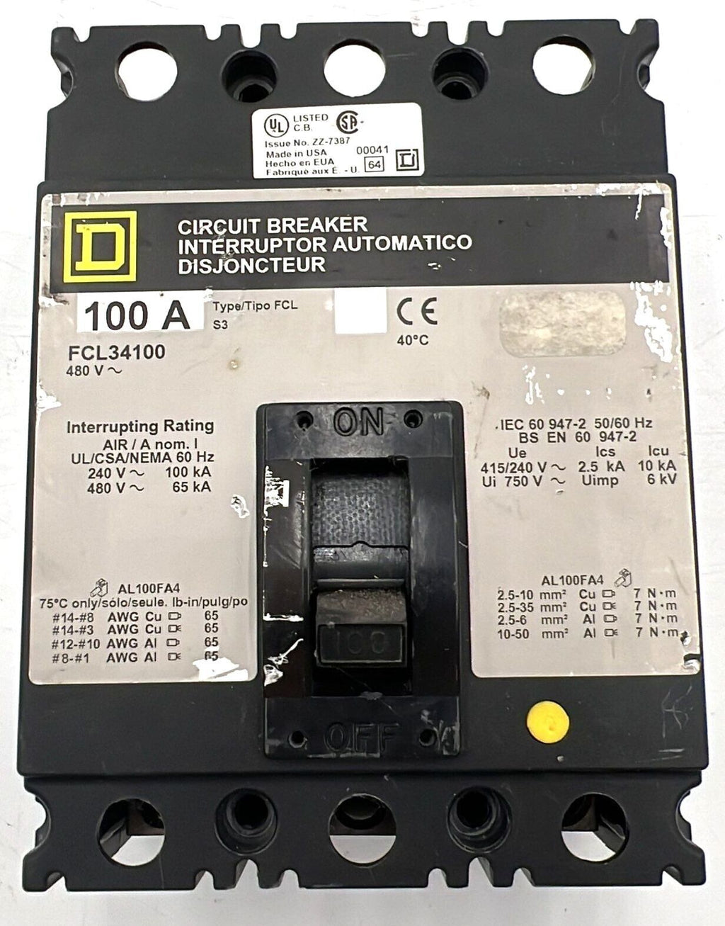 Square D FCL34100 100A 480V 3 Pole Circuit Breaker