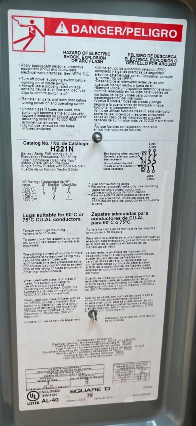 Square D H221N 30A 2P 240V Type 1 Indoor Heavy Duty Safety Switch