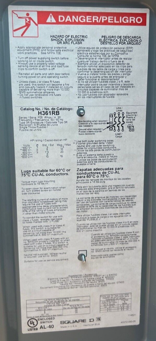 Square D H361RB 30A 600V 3P Type 3R Heavy Duty Safety Switch