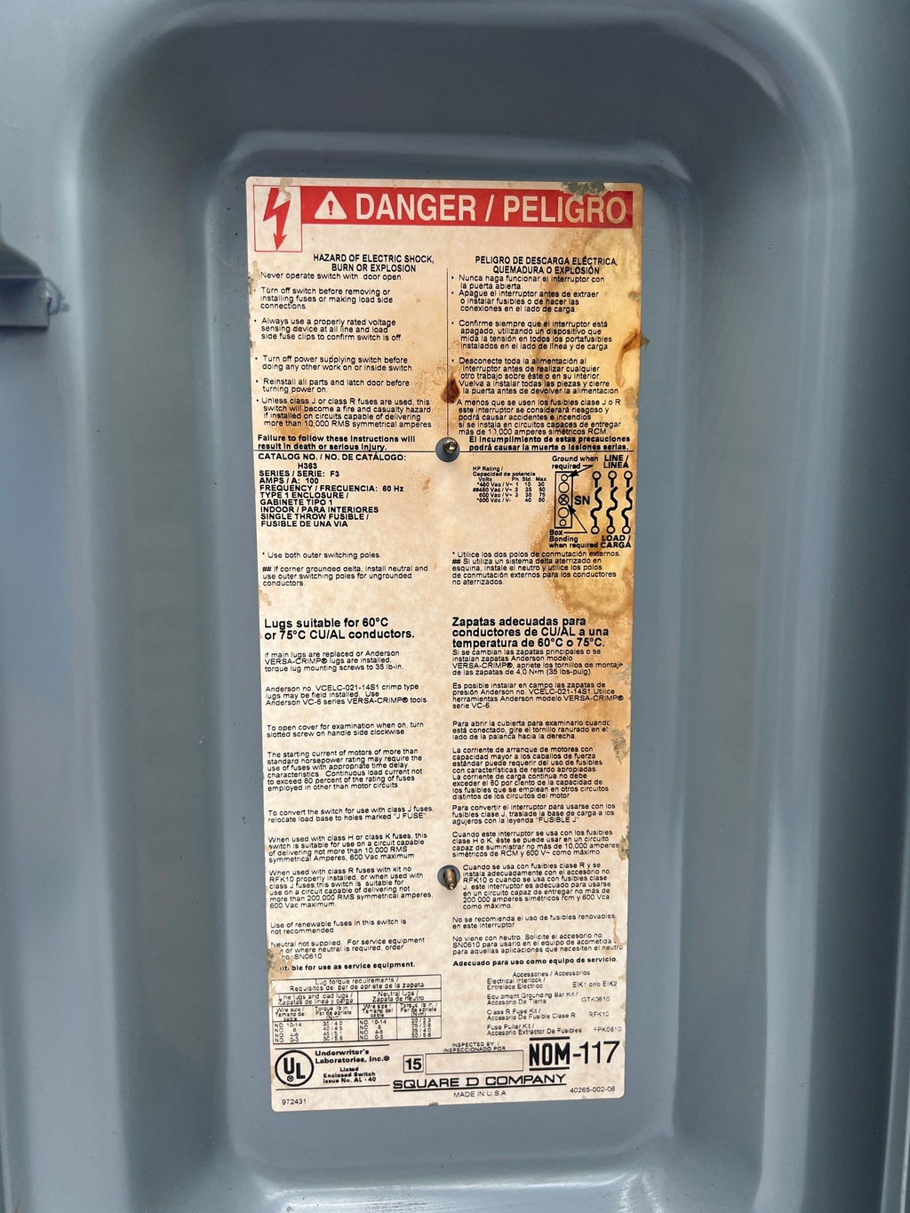 Square D H363, 100 Amp, 600 Volt, Type 1, Heavy Duty Safety Switch