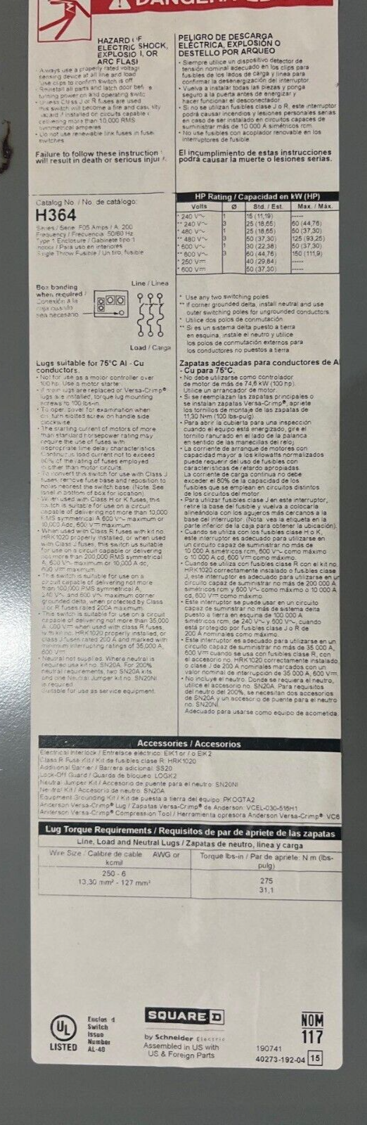 Square D H364 200A 3P 600V NEMA 1 Indoor Single Throw Fusible Safety Switch