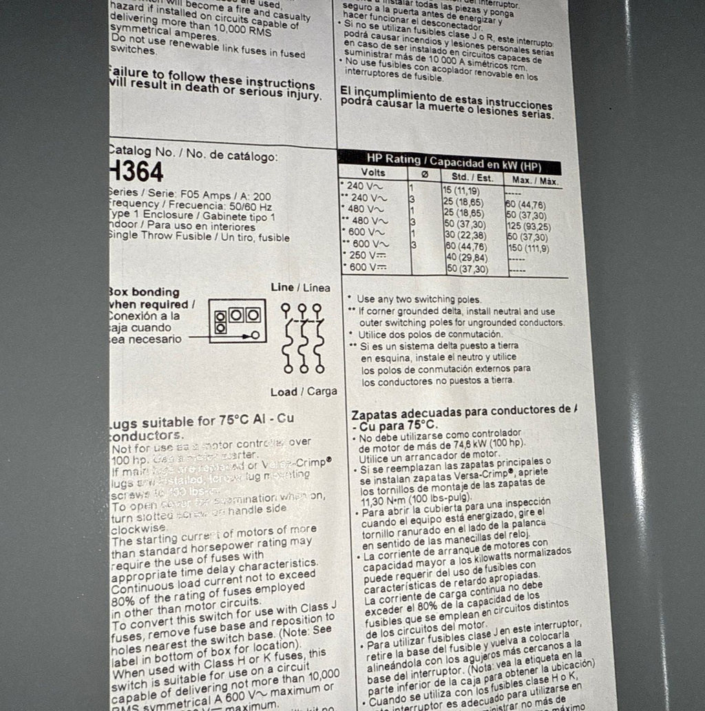Square D H364 200A 3P 600V NEMA 1 Indoor Single Throw Fusible Safety Switch