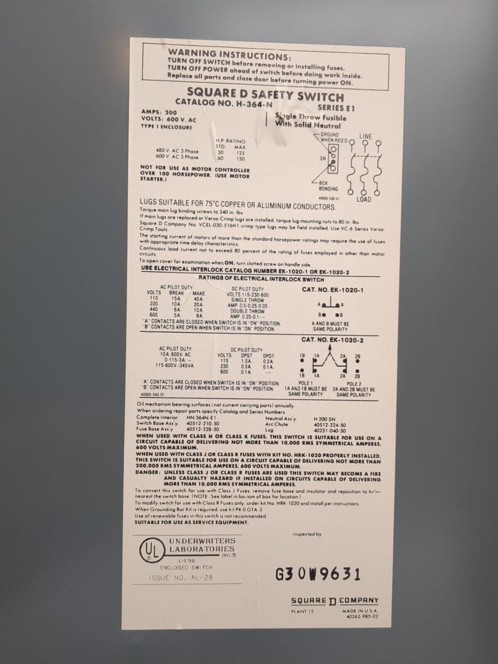 Square D H364N, 200 Amp, 600 Volt, Fusible, NEMA 1, Safety Switch