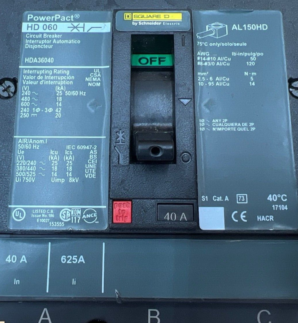 Square D HDA36040 I-Line Circuit Breaker 40A 600V 3P 40 Amp HDA 3 Pole