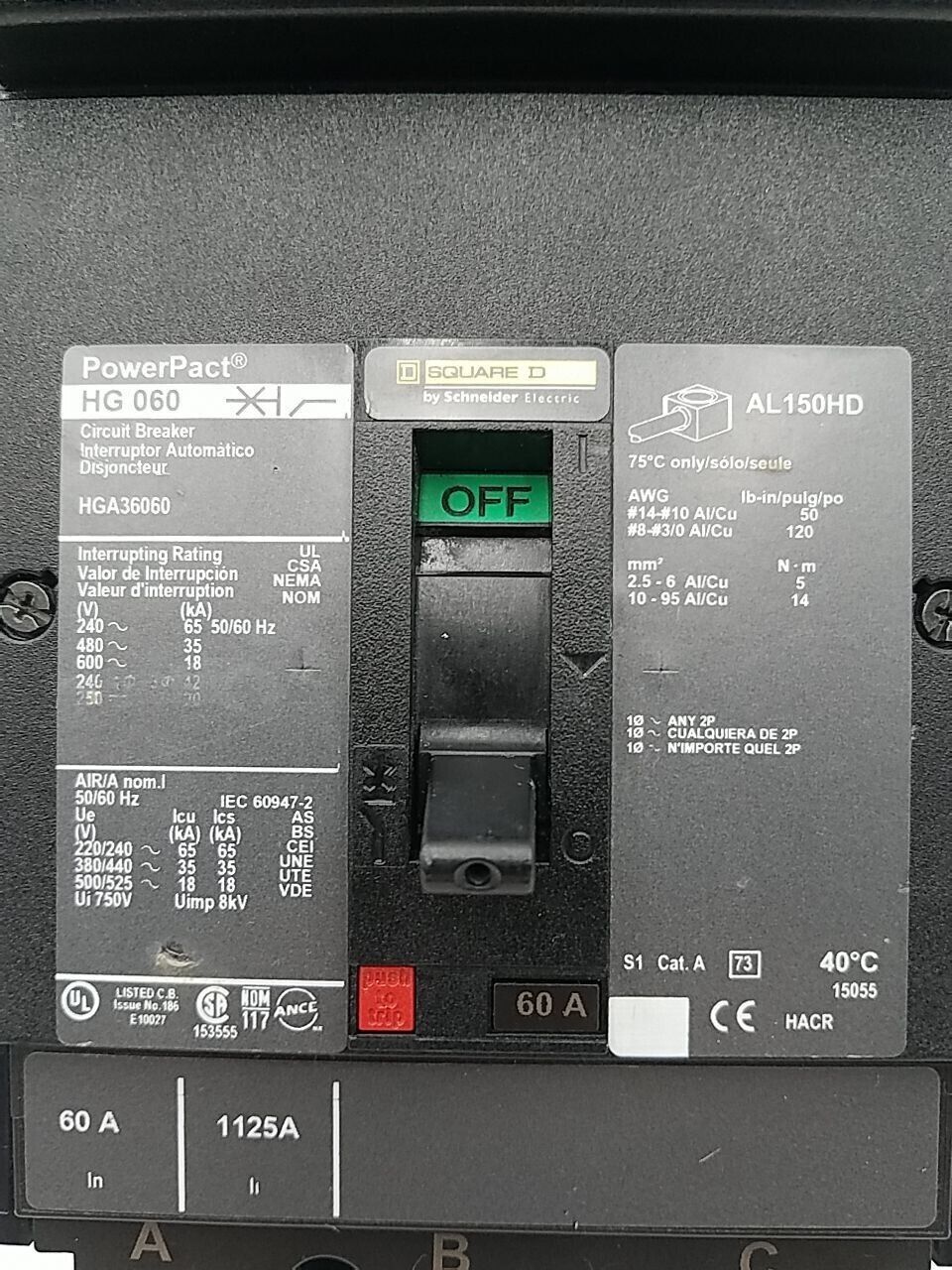 Square D HGA36060 3 pole 60 Amp 600 Volt Circuit Breaker