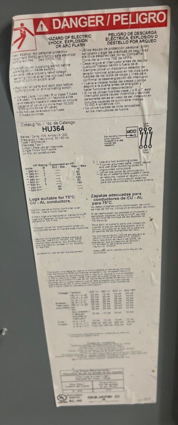 Square D HU364 200A 3P 600V Non-Fusible NEMA 1 Indoor Safety Switch