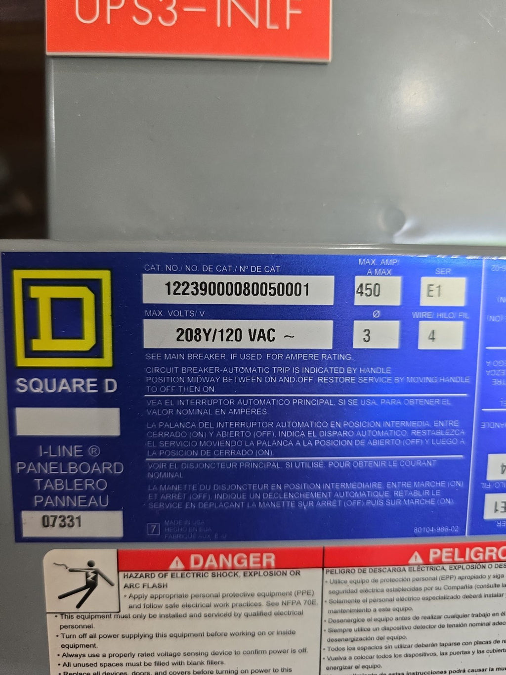 Square D I-Line Panelboard 450A 208/120V 3PH 4W MCB 450 Amp Panel 24 CircuitMain Breaker MGP36450
