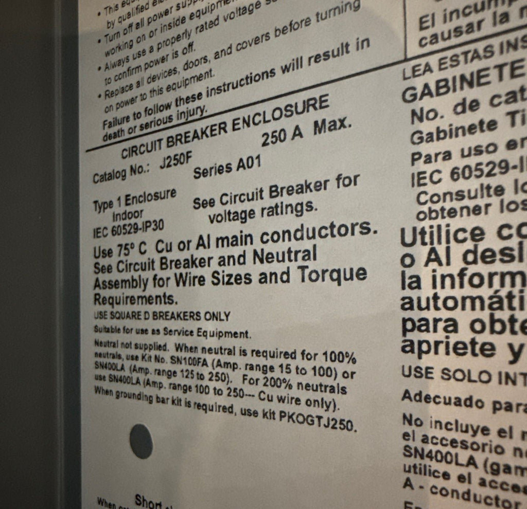 Square D J250F Circuit Breaker Enclosure 250A 600V Flush Mount Type 1 Encl