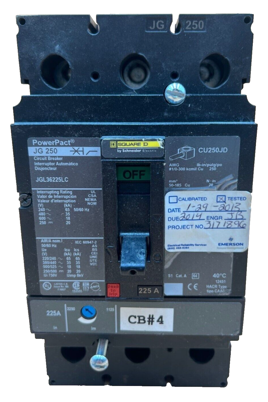 SQD JGL36225LC Circuit Breaker 225A 3P 600V 3PH Lug to Lug