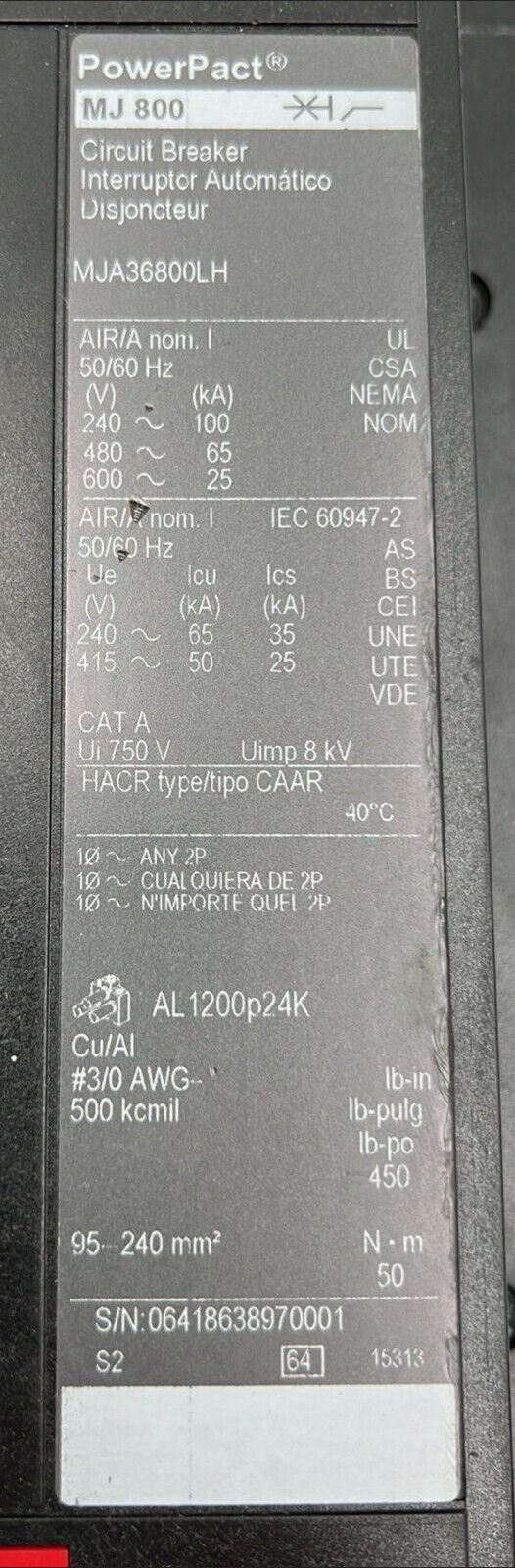 Square D MJA36800LH 800A 600V 3 Pole Circuit Breaker