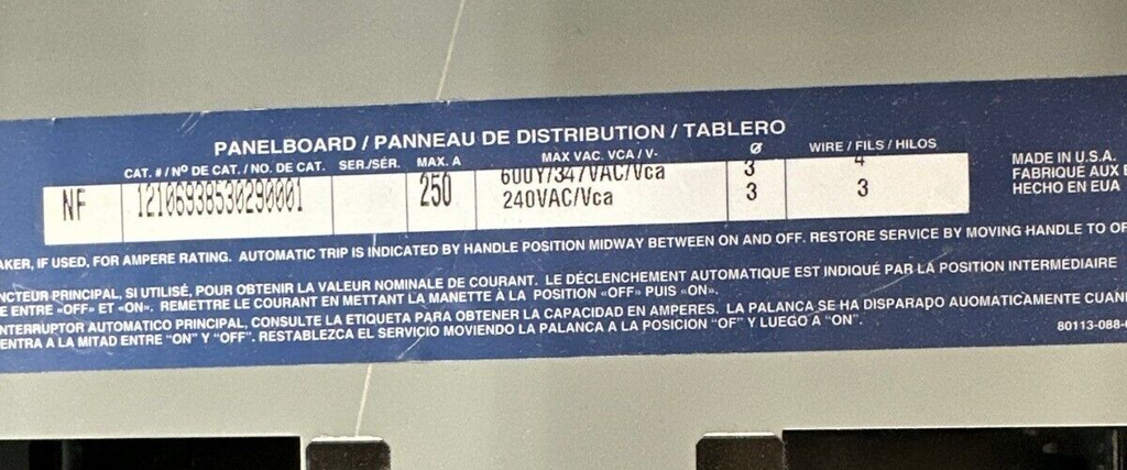 Square D NF Panelboard 250A 600Y/347V 240V 3PH 4W 42 Circuit 250 Amp Box MH44: 44" x 20" x 6"