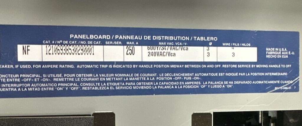 Square D NF Panelboard 250A 600Y/347V 3PH 4W 42 Cir Box MH44 Main Lug MLO 250Amp