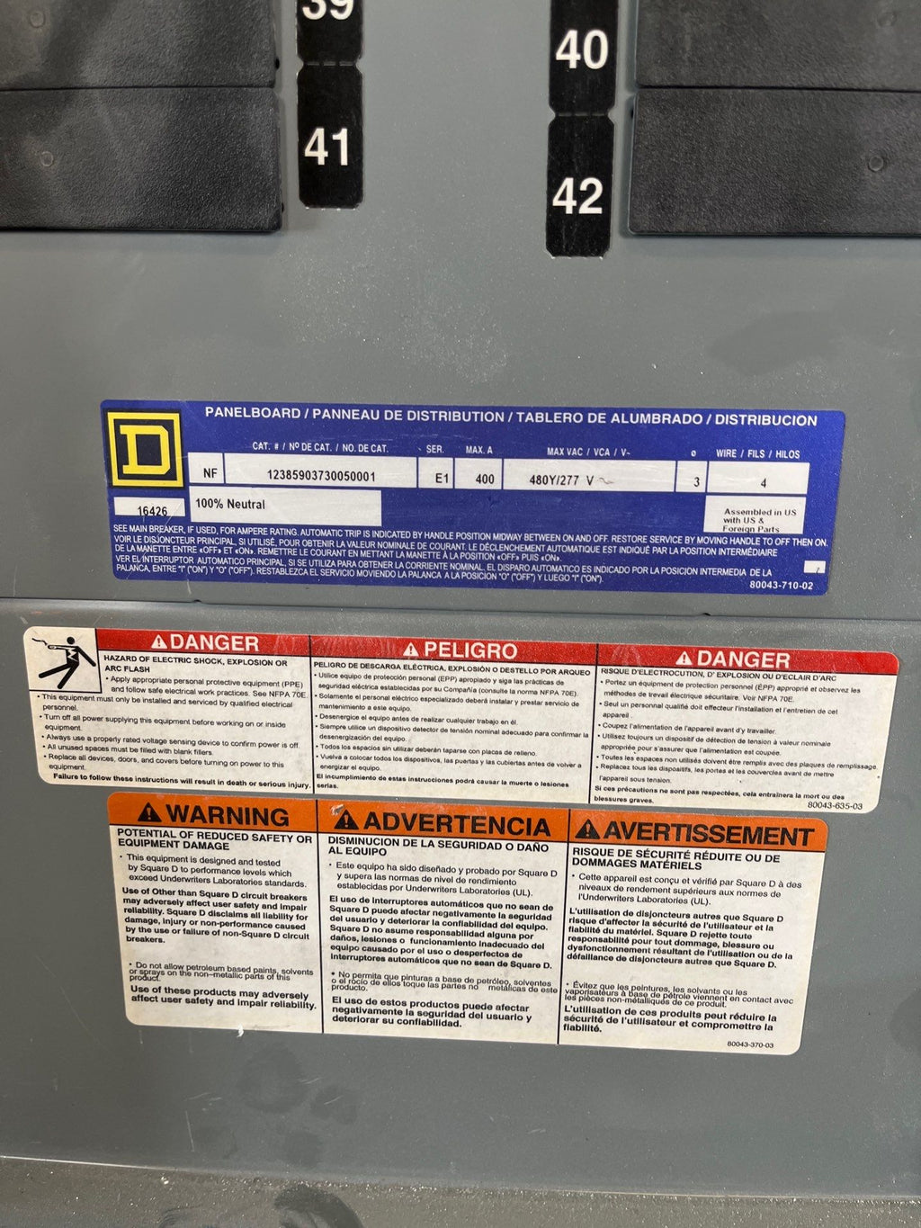 Square D NF Panelboard 400A 480/277V 3PH 4W 42Cir MLO Indoor Encl MH74