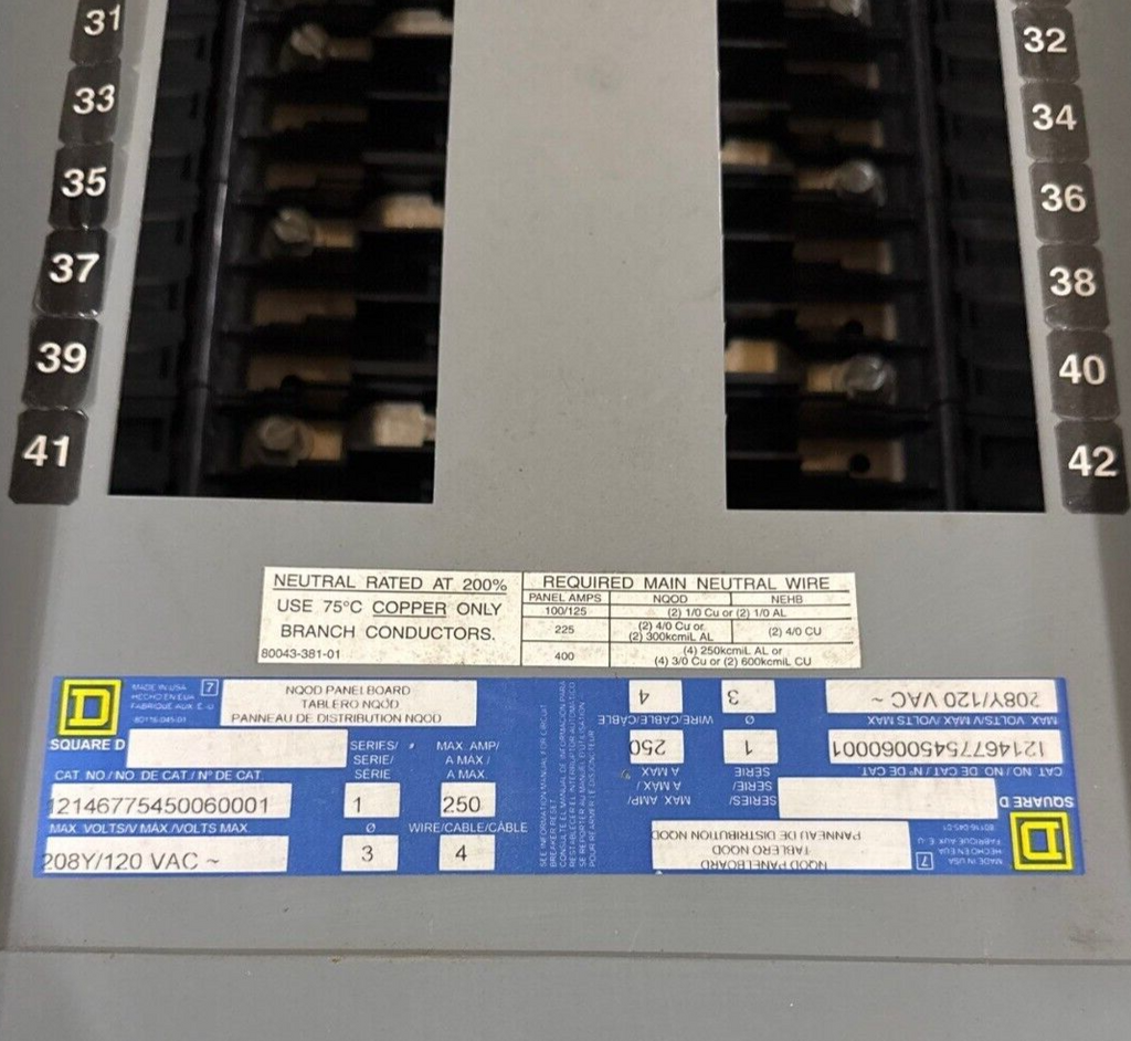 Square D NQOD Panelboard 250A 400A 208/120V 3PH 4W 42 Circuit Indoor Encl MCB P300 Used