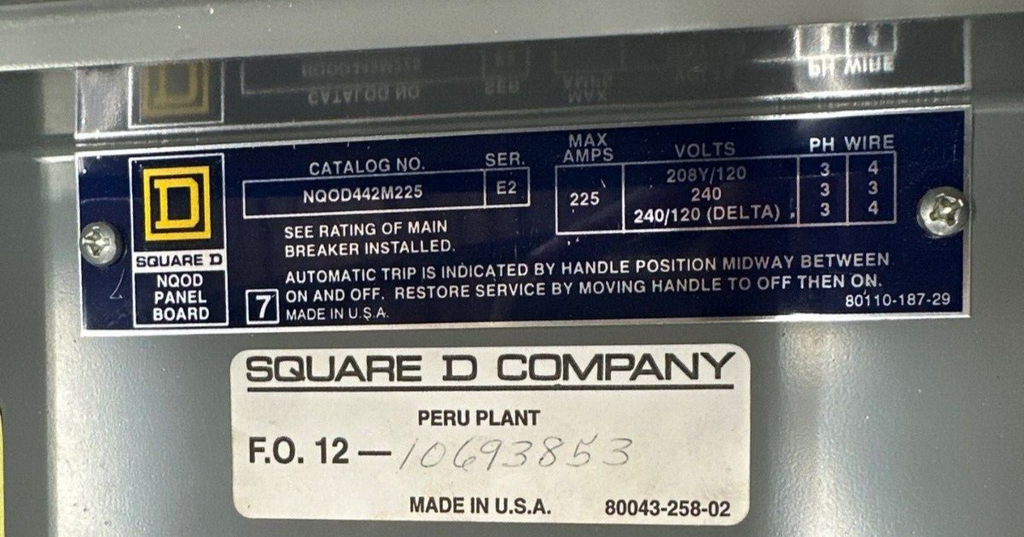 Square D NQOD442M225 Panelboard 225A 208Y/120V 3PH 4W Main Breaker Q2L3100 MCB P400 Used