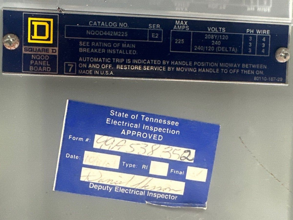Square D NQOD442M225 Panelboard 225A 208Y/120V 3PH 4W MCB Main Q2L3100 NQOD P413 Used