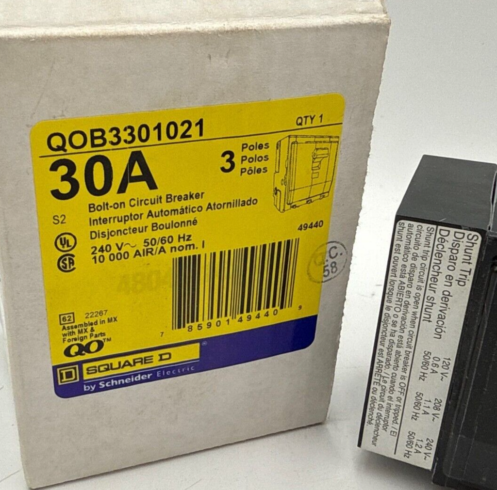 Square D QOB3301021 Circuit Breaker 30A 3P 240V QOB 30 Amp 3 Pole Shunt Trip