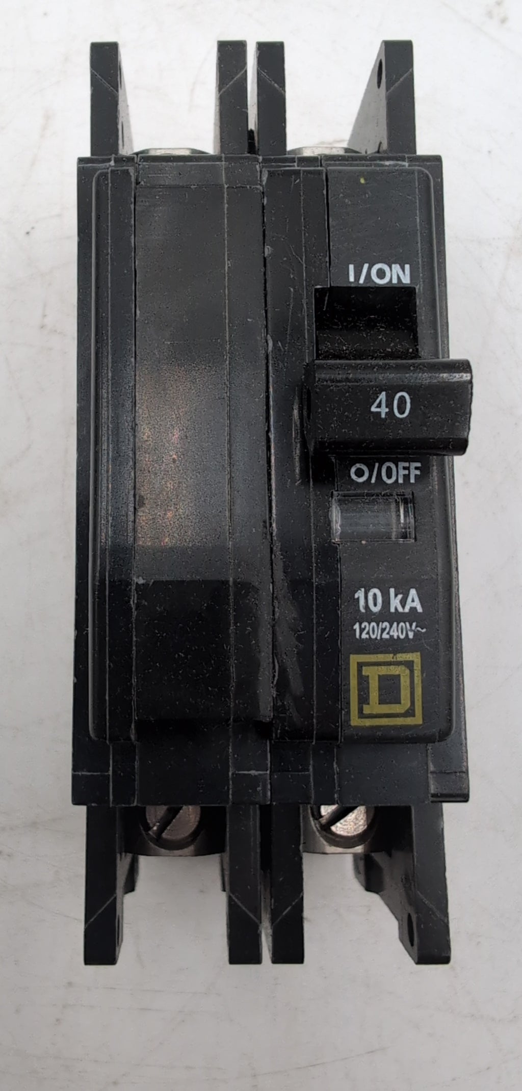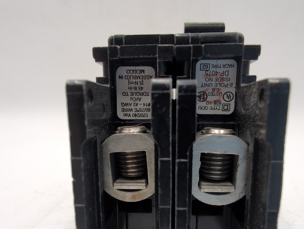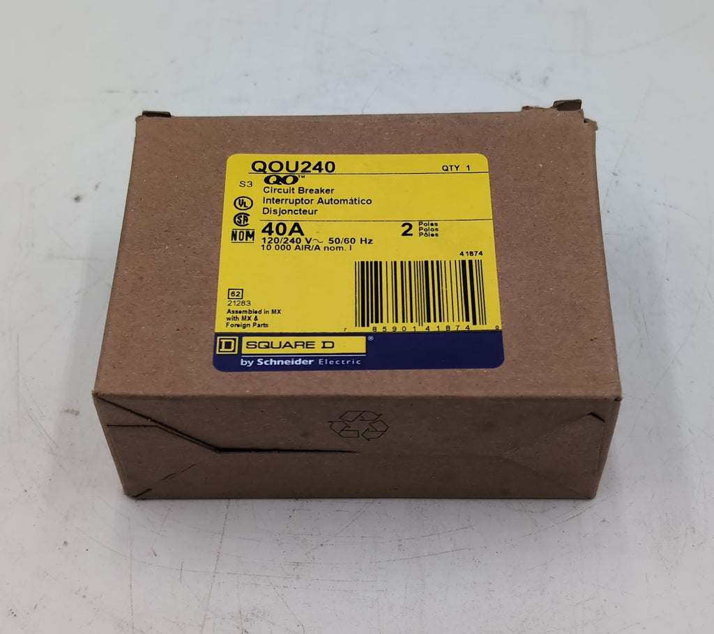 Square D QOU240 2-pole, 40-amp miniature circuit breaker. This thermal magnetic breaker provides essential overcurrent and short-circuit protection for both AC and DC systems. It is suitable for various applications in commercial, industrial, and OEM settings.