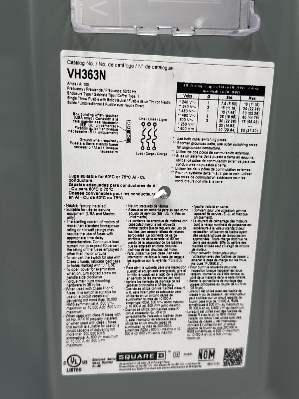Square D VH363N Safety Disconnect Switch 100A 3P 600V Type 1 Indoor Enclosure 100 Amp 3 Pole