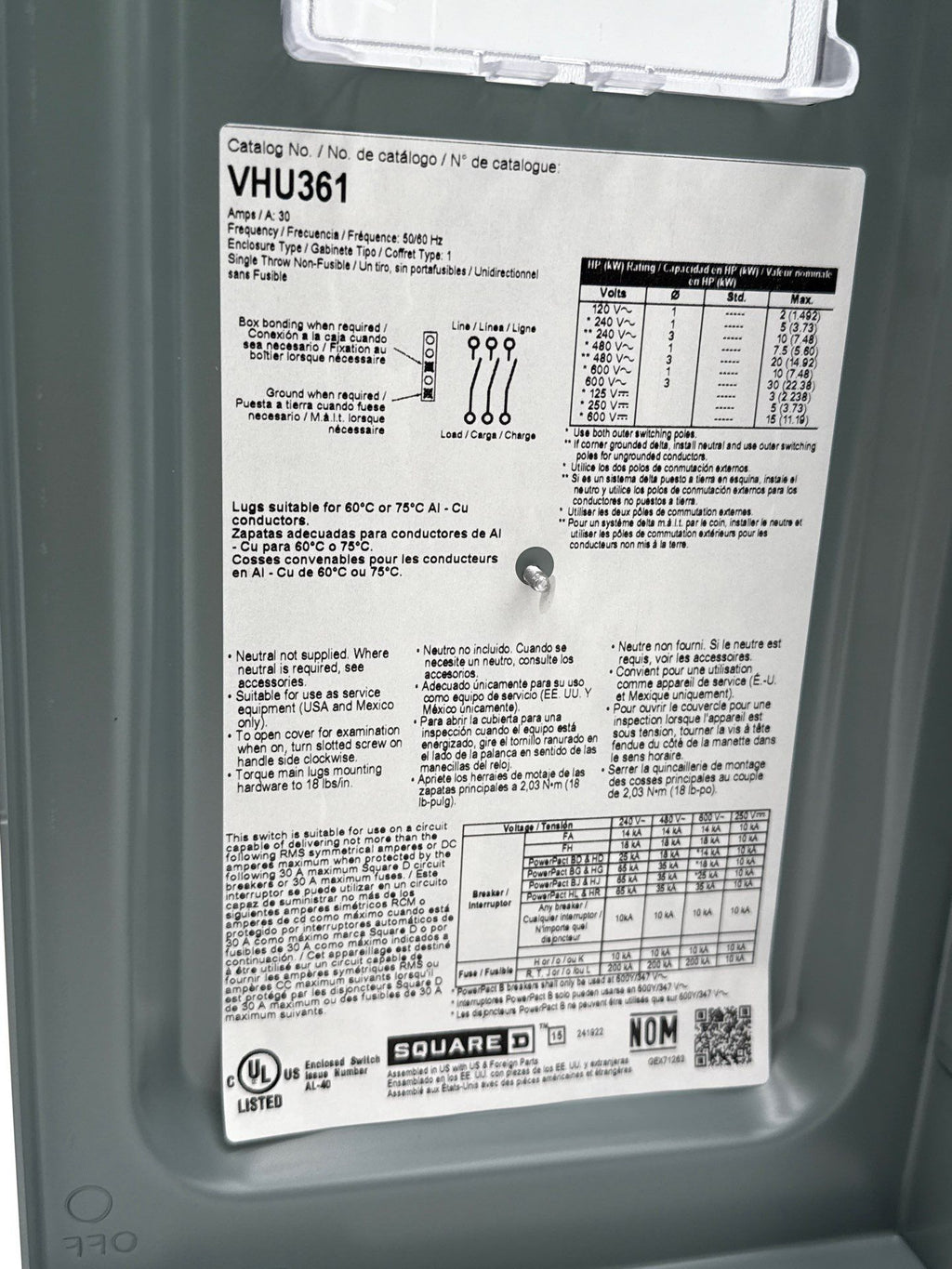Square D VHU361 Safety Disconnect Switch 30A 3P 600V VisiPacT Type 1 Indoor30 Amp 3 Pole
