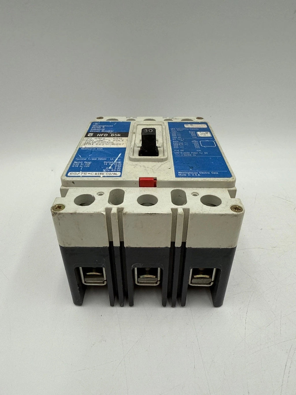Westinghouse HFD3030L Circuit Breaker 30A 3P 600V 3PH HFD Bolt On 30 Amp 3 Pole