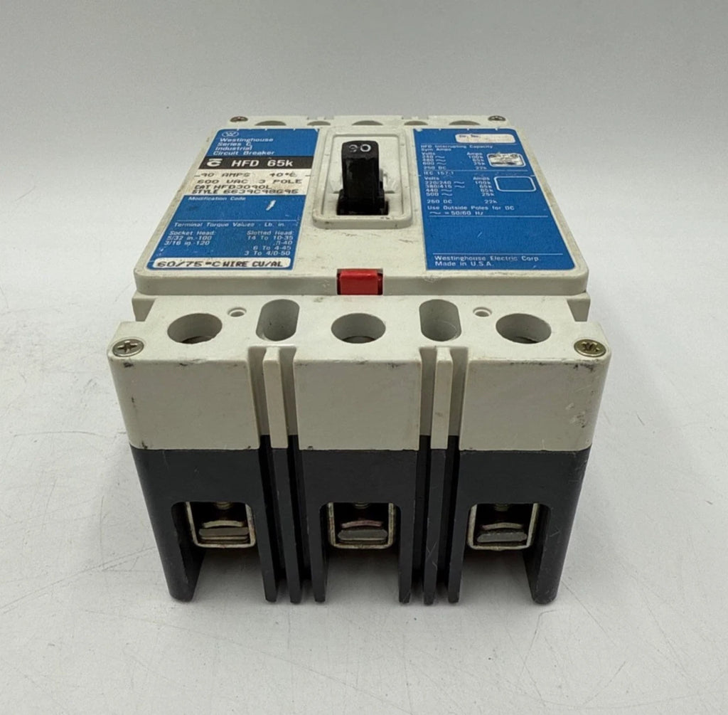 Westinghouse HFD3090L Circuit Breaker 90A 600V 3P HFD 65k 90 Amp 3 Pole Used